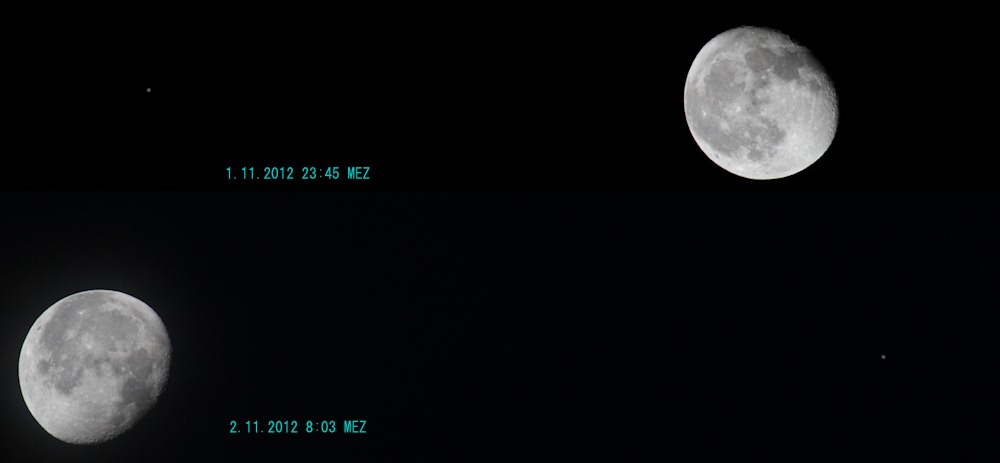 Astronomie Konjunktion Mond & Jupiter Geschrieben von admin am 2. November 2012. Diese Nacht standen Mond und Jupiter nahe beieinander. (Jupiter ist der kleine Fleck am Bildrand gegenĂĽber dem Mond). Oben: 1.11.2012 23:45 MEZ Unten: 2.11.2012 8:03 MEZ
