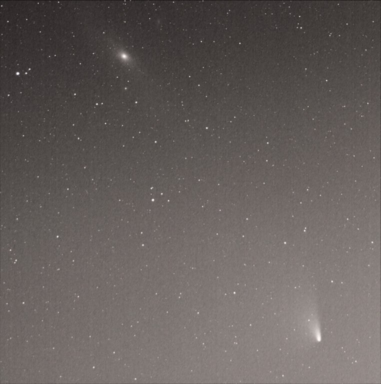 Astronomie Komet PANSTARRS C/2011L4 und Andromedagalaxie M31 Geschrieben von admin am 1. April 2013. Komet PANSTARRS C/2011L4 und Andromedagalaxie M31. Einzelbild (oben) und Versuch eines Stacks aus 10 Bildern.