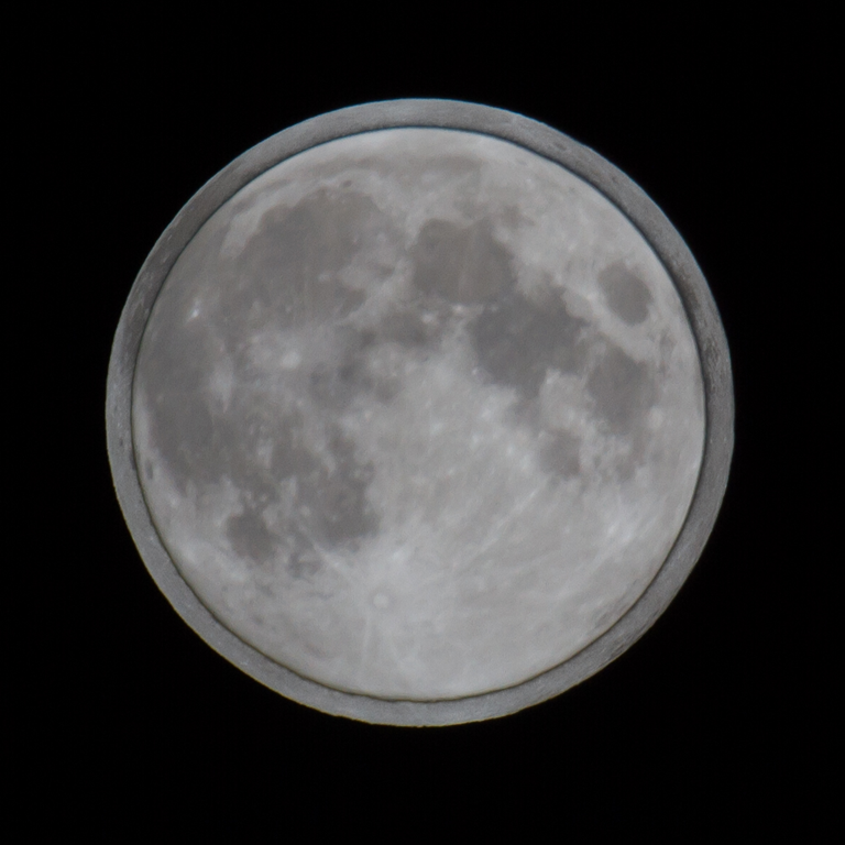 Am Samstag, dem 29.8.2015 war der Vollmond der Erde mal wieder besonders nahe und erschien dadurch etwas größer als gewöhnlich. Um dies im Foto zu zeigen, vergleiche ich den Vollmond gegen einen, den ich am 29.9.2012 mit der gleichen Kamera und dem gleichen Objektiv aufgenommen wurde. Der Unterschied der scheinbaren Größe ist gut zu erkennen.