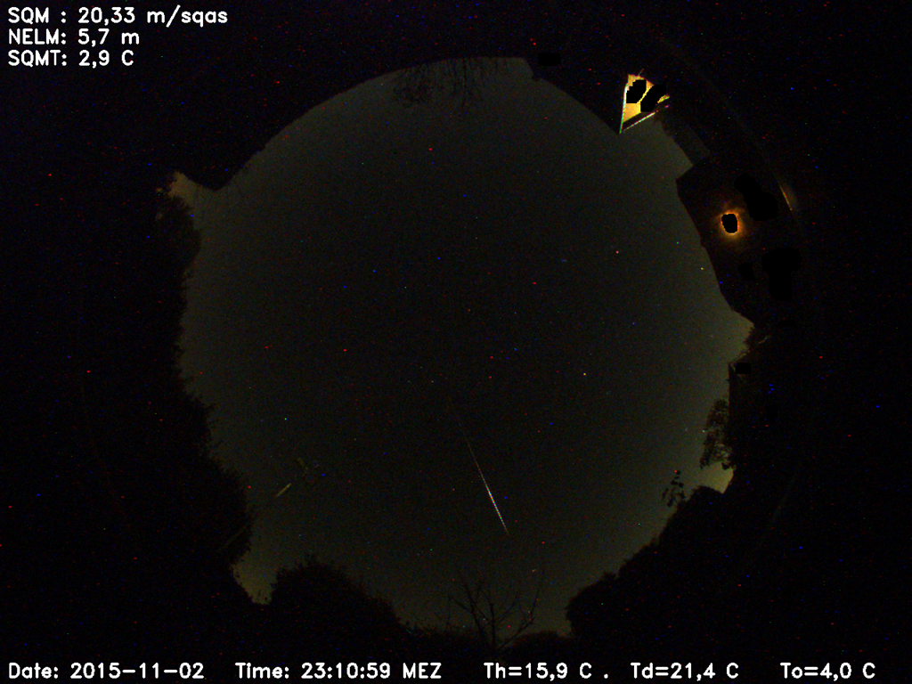 Astronomie Helles Meteor am 2.11.2015 23:10 MEZ Geschrieben von admin am 2. November 20153. November 2015. Video des Meteors Das Meteor auf der AllSkyKamera Das Summenbild des Meteors. Es handelt sich um ein sporadisches Meteor -4,7ter Größe.