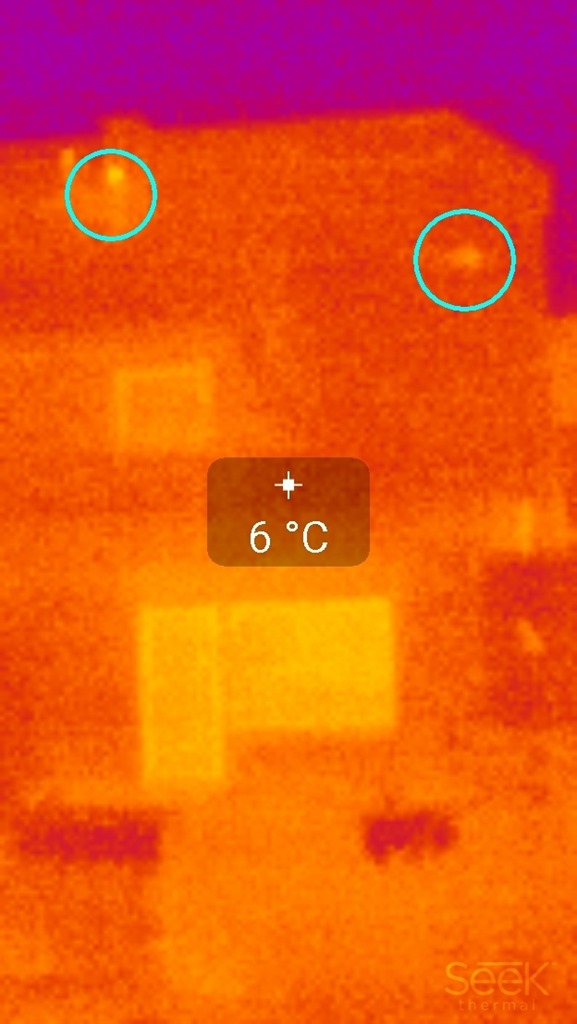 Eine Aufnahme eines Hauses zeigt hohe Temperaturen am Kamin und einem LĂŒftungsauslass (Kreise) sowie an den Fenstern. AuĂentemperatur war etwa 6°Celsius.