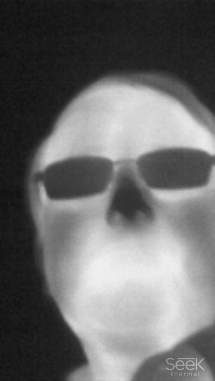 Zuerst musste natĂŒrlich der Kamerabesitzer als Fotomotiv dienen. Im linken Bild sind niedrige Temperaturen als dunkle Graustufen (Nase) kodiert. Im rechten Bild sind violette Töne die niedrigen Temperaturen.