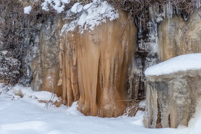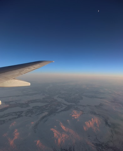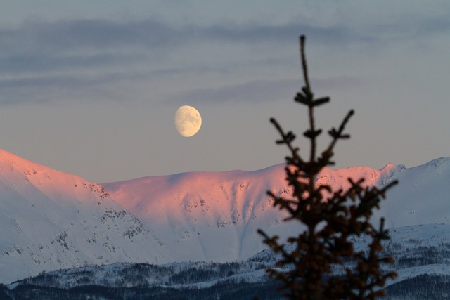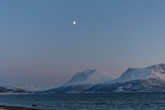 Nochmal der Mond über eisiger Landschaft. Die Sonne ist bald zurück und bescheint schon die höchsten Berggipfel.