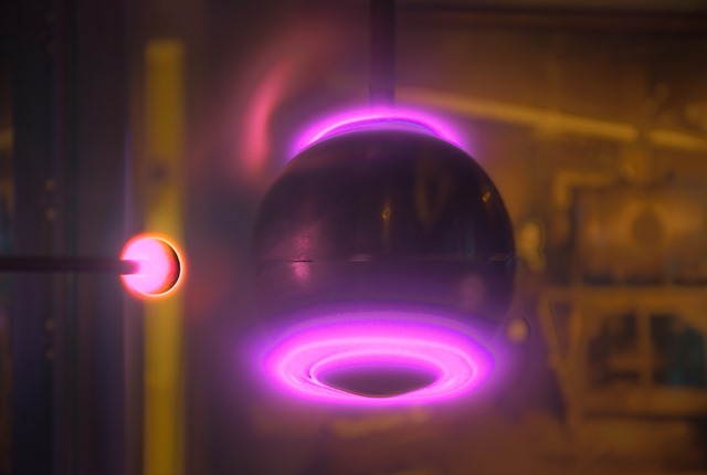 Kristian Birkelands “Terella”, eine magnetisierte Modellerde, auf die in einem Raum mit niedrigem Gasdruck Elektronen geschossen werden die die Gas Atome zum Leuchten anregen. Gesehen im Universitätsmuseum Tromsö.