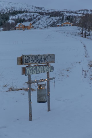 Winterlandschaft an unserer Unterkunft “Yggdrasiltunet”.