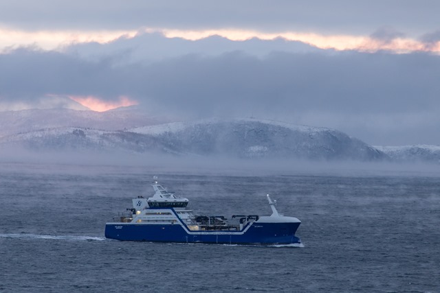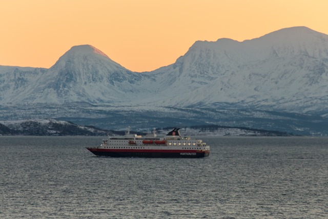 Hurtigruten-Schiff “Nordlys” im Fjord.