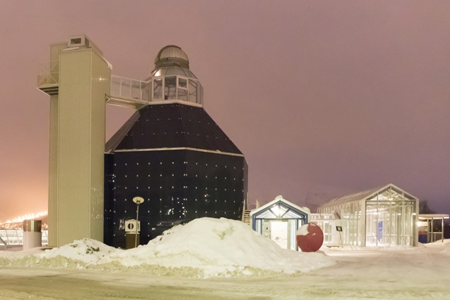 Das Vitensenter. Die Kuppel auf dem Dach beinhaltet ein Teleskop, das gerade im Aufbau befindlich ist. Der Runde Gebäudeteil unterhalb davon enthält ein Planetarium in dem ein Film zum Polarlicht gezeigt wurde.