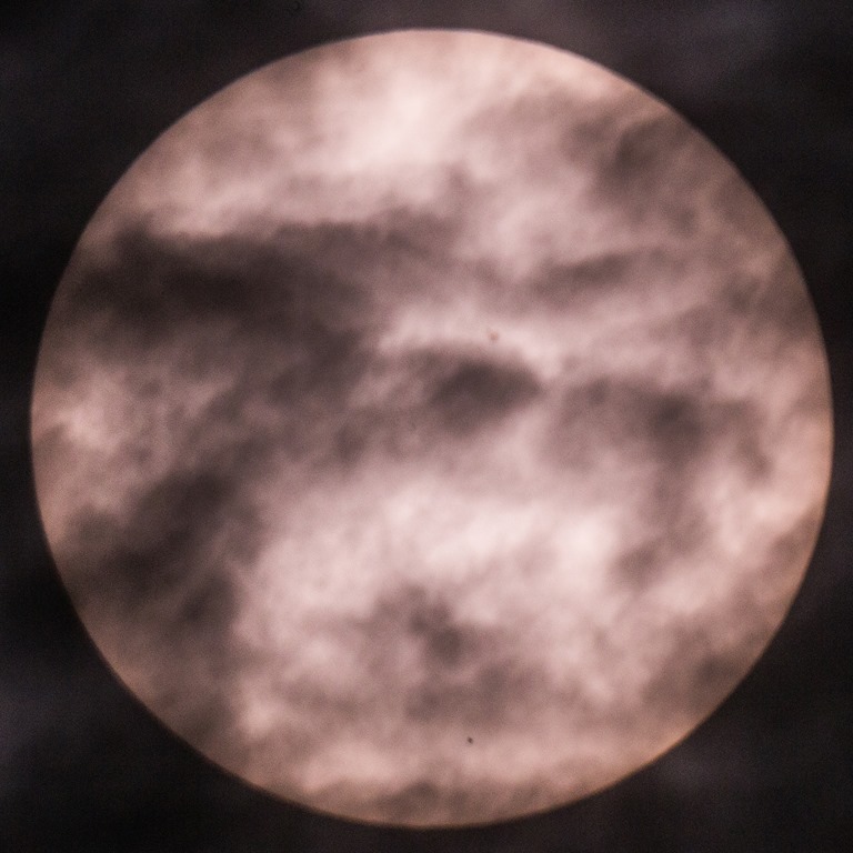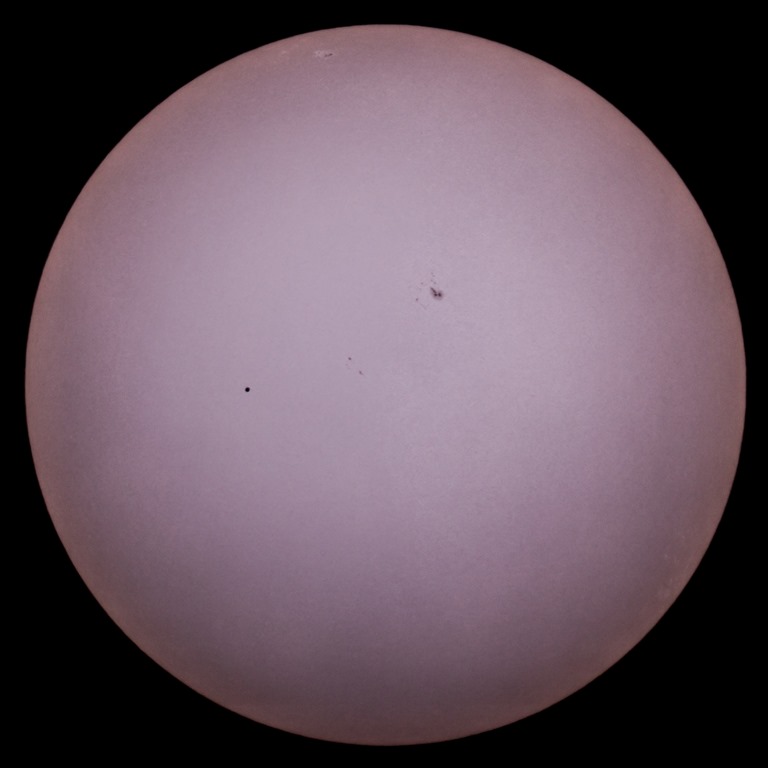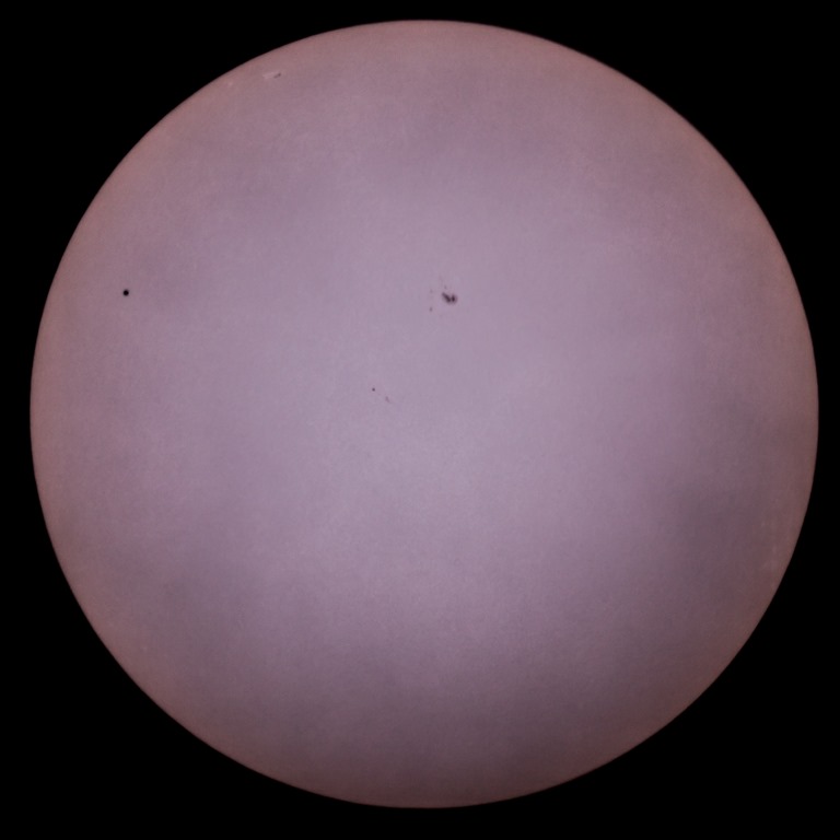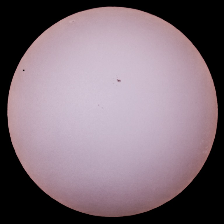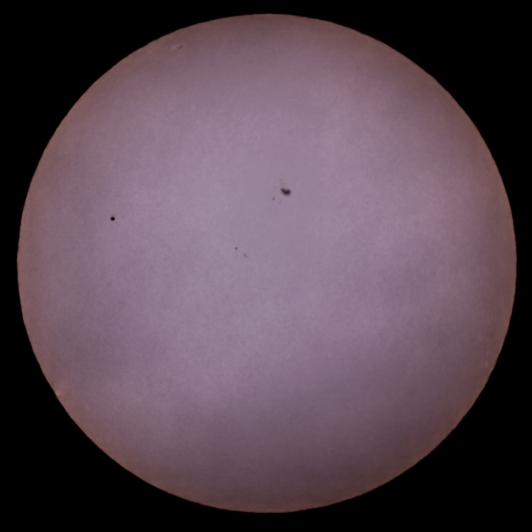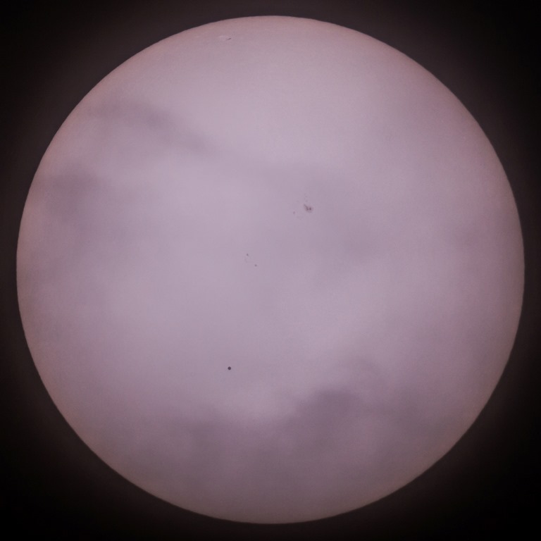 Heute ging der Planet Merkur vor der Sonnenscheibe vorbei. Das Ereignis fand von 13:12 MESZ bis zum Sonnenuntergang statt. Die zweite Hälfte war jedoch wegen aufziehender Wolken nicht mehr gut zu beobachten.