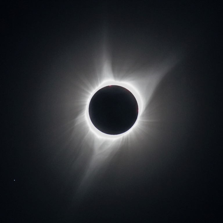Korona in der Totalitätsphase. Der Punkt unten links ist der Stern Regulus.