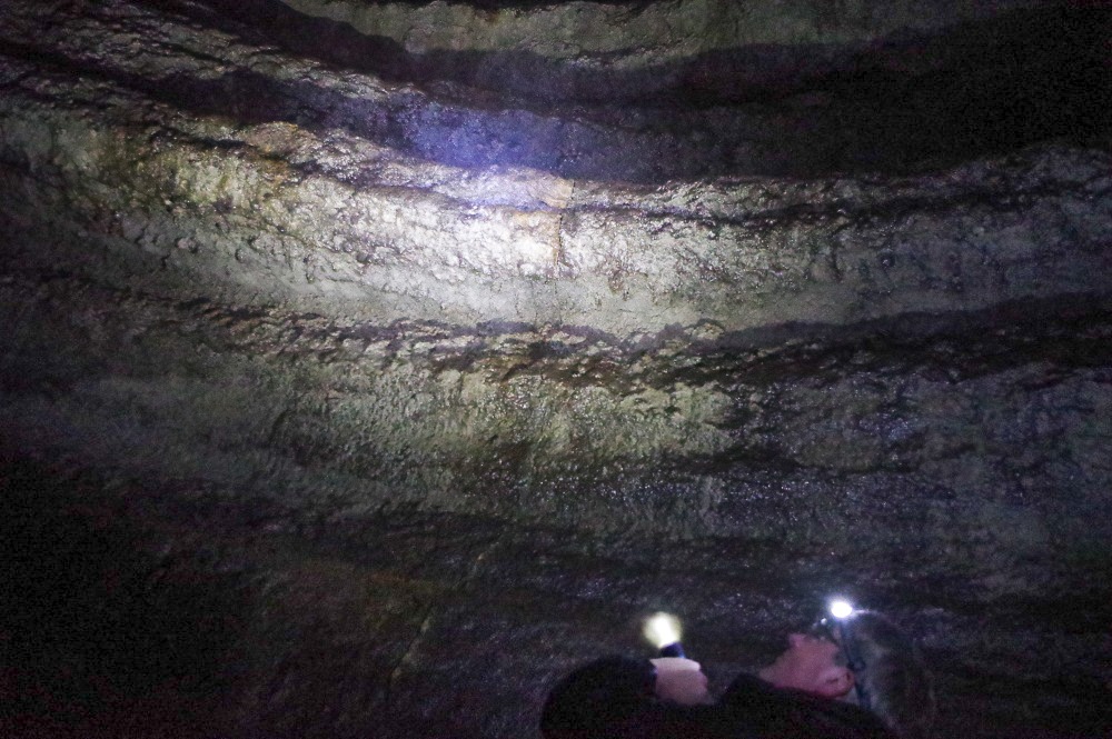 Wir haben die untere Höhle mit Stirn- und Taschenlampe erkundet.