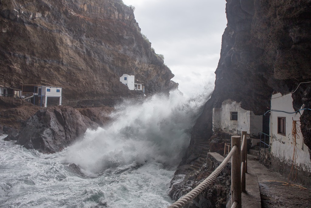 Hohe Wellen kommen ĂĽber den Eingang der Bucht hinein.