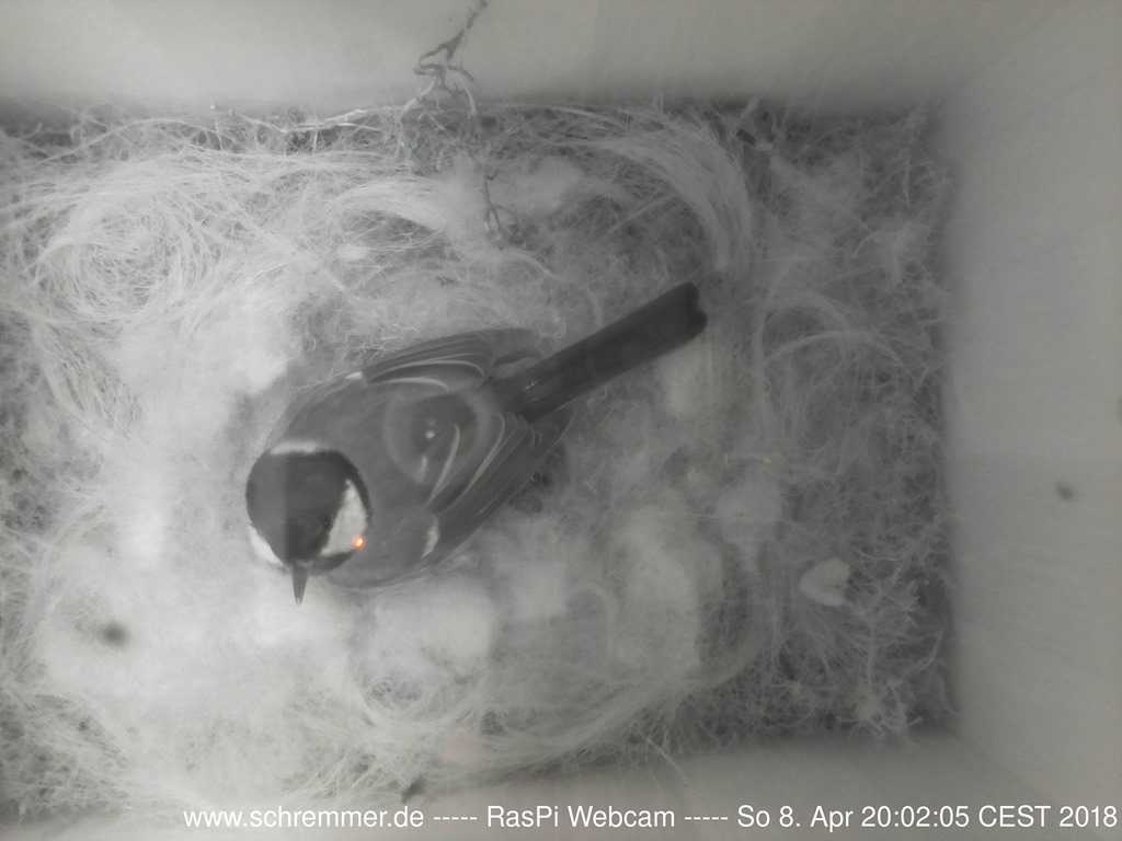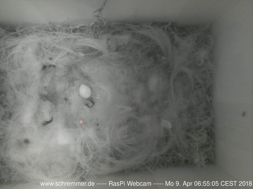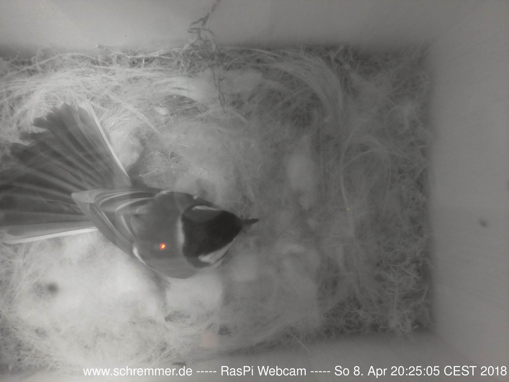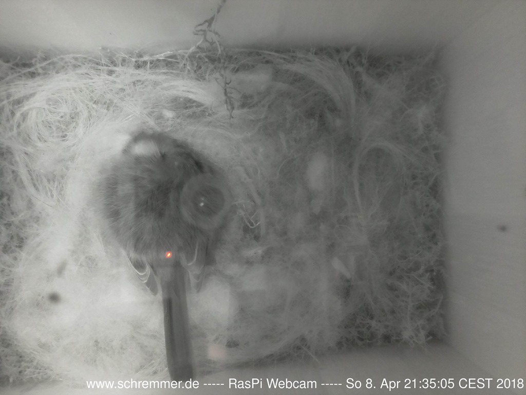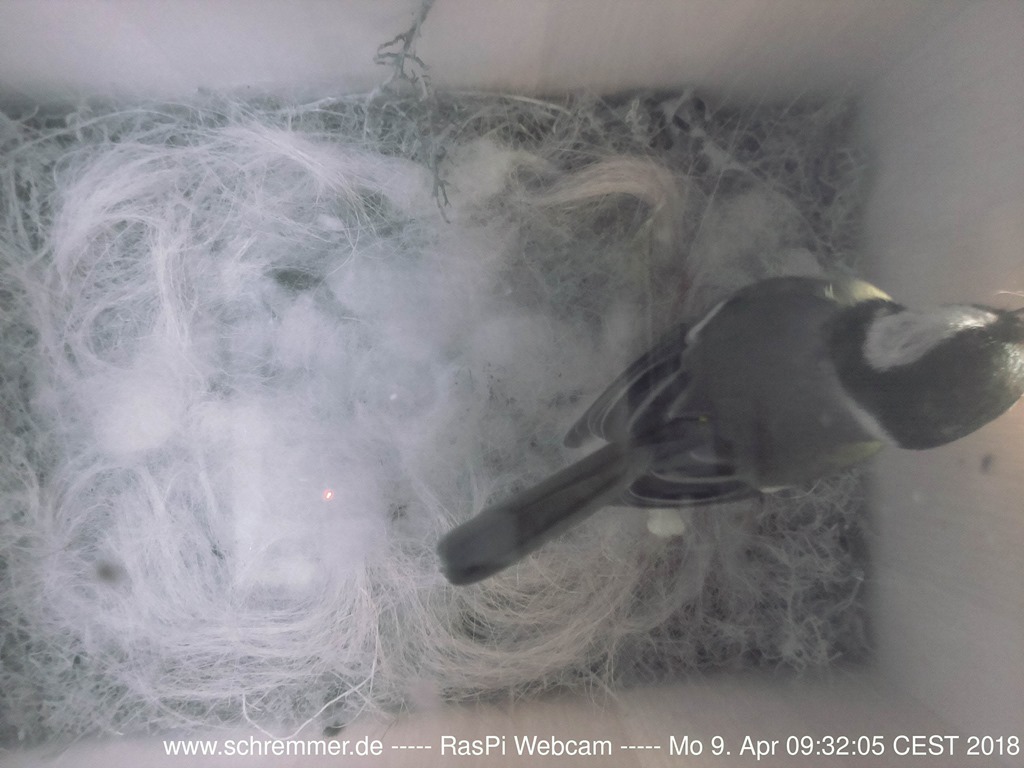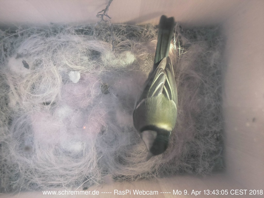 Die Meisen haben das Nest weiter ausgepolstert und benutzen dazu auch Schafswolle, die zufällig in der Nähe hing.