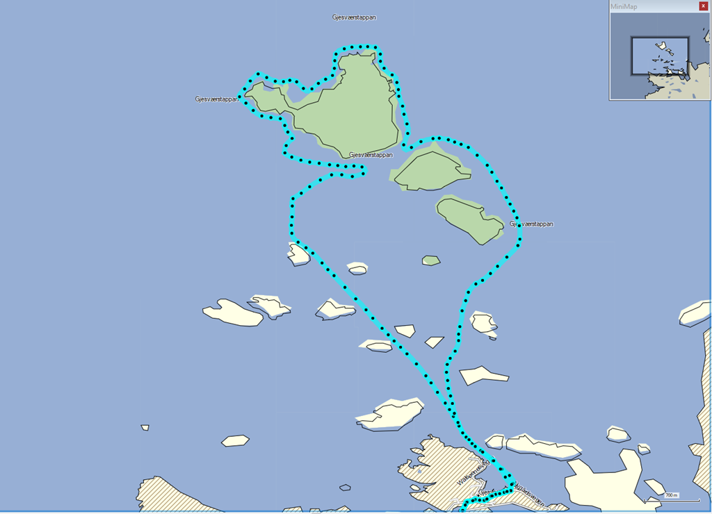 Birdsafari mit dem Schiff von Gjesvær um vorgelagerte Inseln. Es war ziemlich regnerisch an diesem Tag. Es waren tausende Vögel zu sehen. Karte © Openstreetmap
