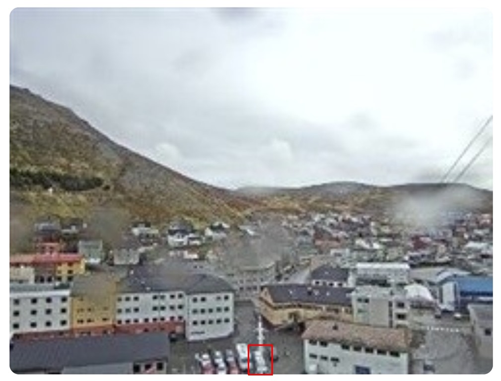 Die Webcam des Schiffes zeigt die Stadt und auch unseren Leihwagen (rotes Rechteck).