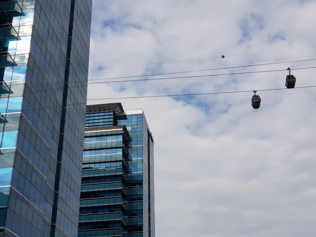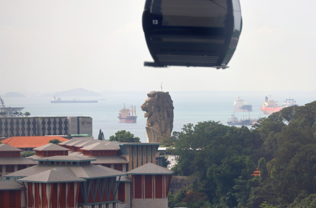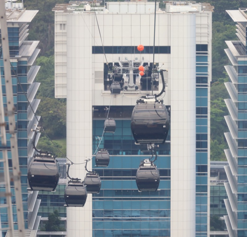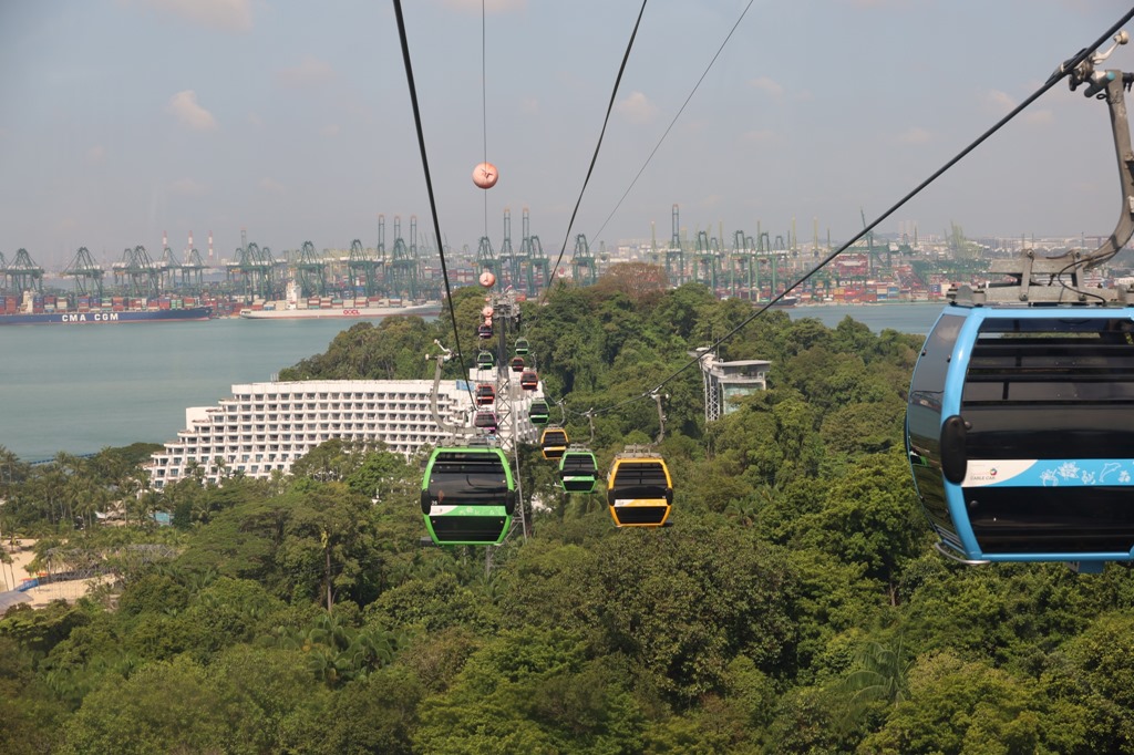 Die Seilbahn fährt direkt durch ein Hochhaus zur Insel Sentosa und in die andere Richtung auf den Faber Berg.