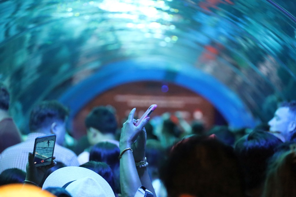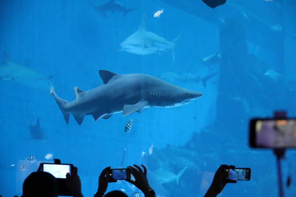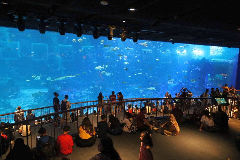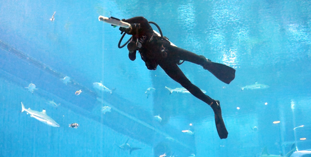Im S.E.A. Aquarium putzen Taucher die Scheiben und teilen sich das Becken mit Haien. |