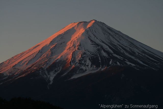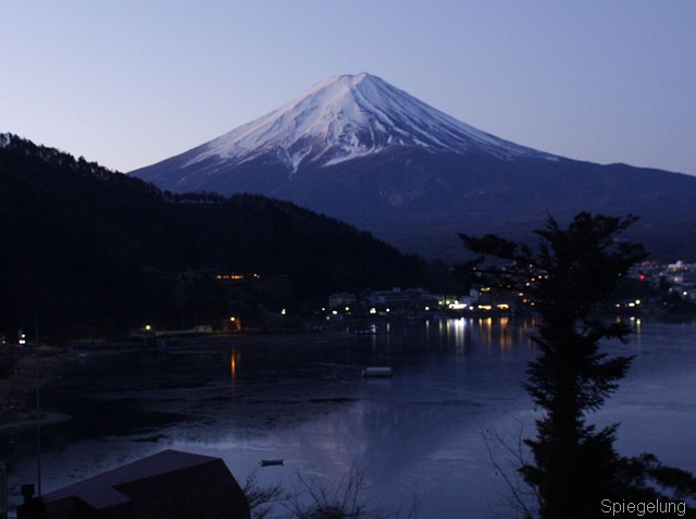 In der Nacht wurde es –10 Grad Celsius kalt, was sogar eine 1-2cm dicke Eisschicht auf dem See hervor brachte. Am Morgen bei Sonnenaufgang spiegelte sich dann der Fuji auf dem Wasser bzw. Eis.