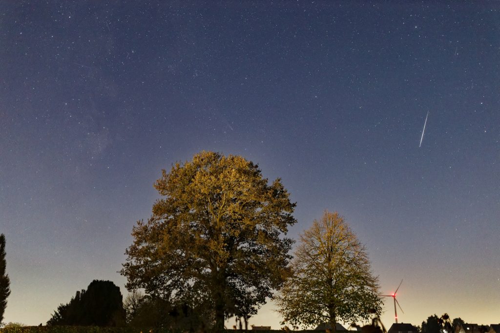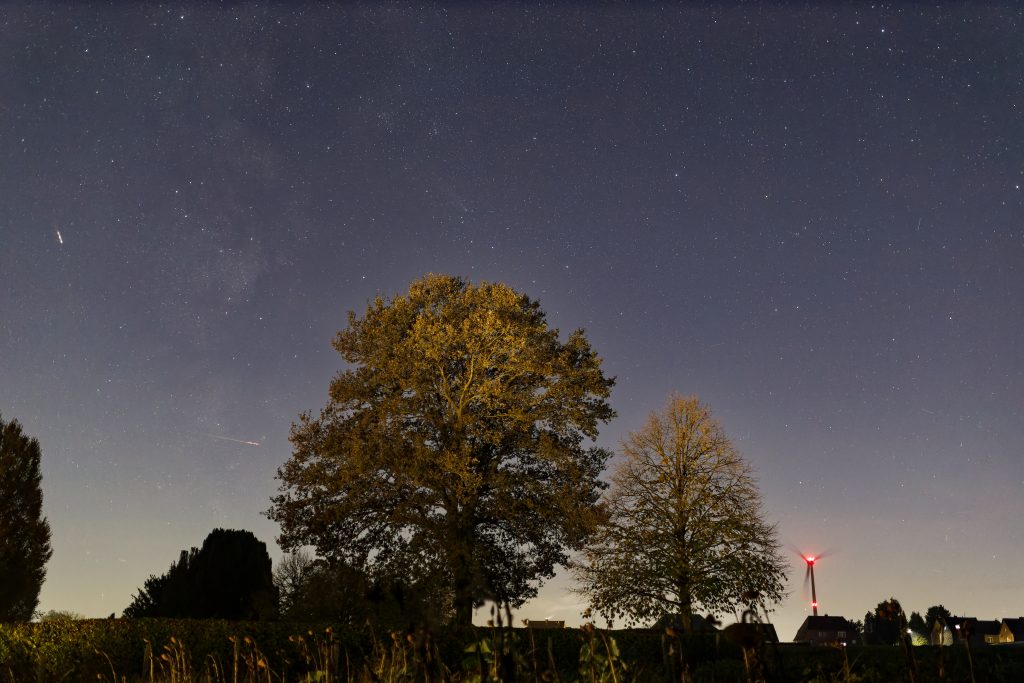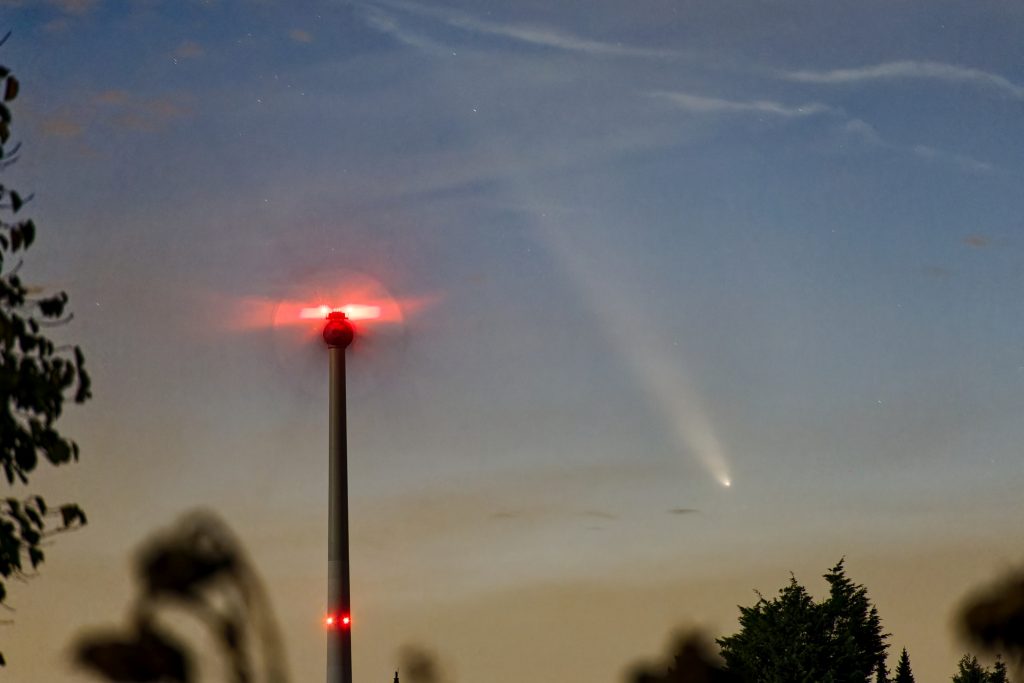 Der Komet am Abend des 13.10.2024 in NiederkrĂĽchten ĂĽber der Windkraftanlage.