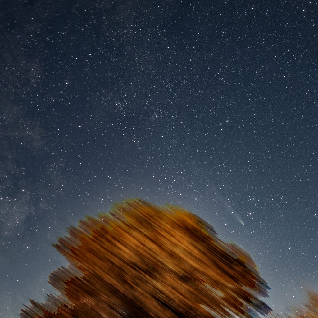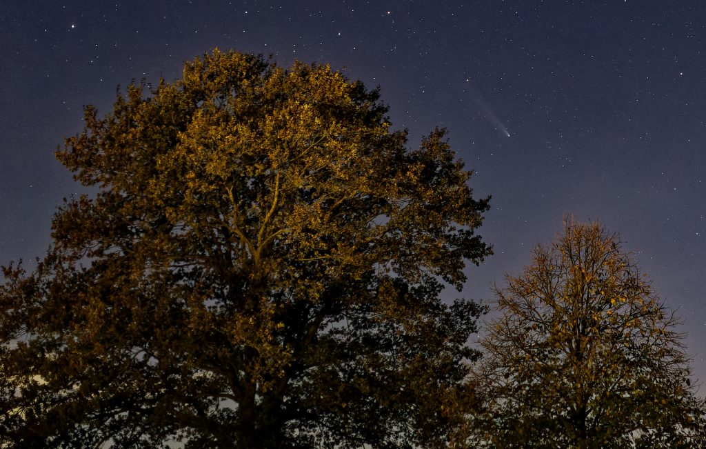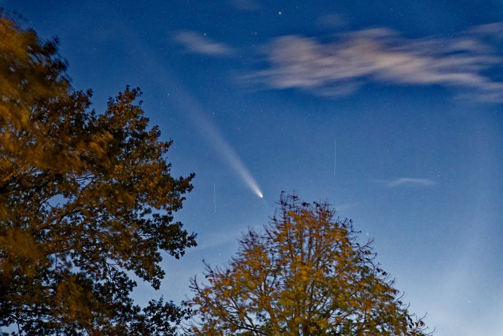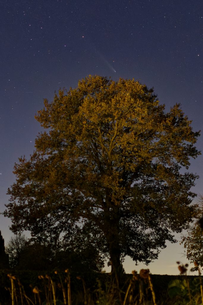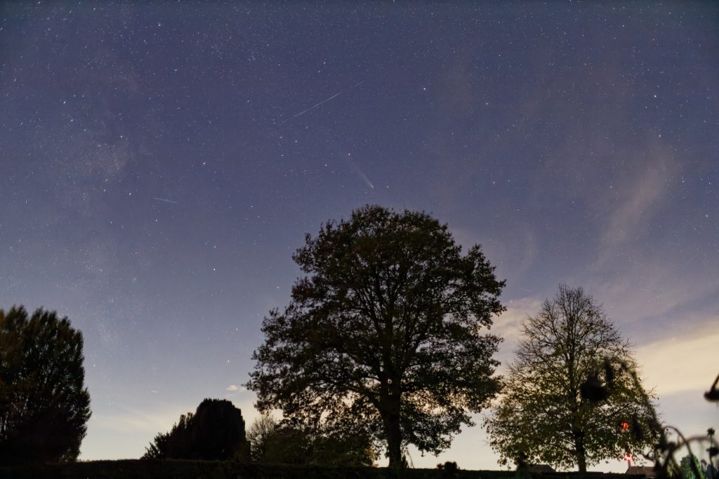 Gegen 19:22 MEZ ist rechts im Bild noch eine Kette von Starlink Satelliten von einem Start vor einem Tag (G10-13) zu sehen. Sie sind noch so nahe beieinander, dass bei der Belichtungszeit von 3 Sekunden nur ein Strich gezeigt wird und keine Einzelsatelliten. Der Komet ist ĂĽber dem Baum in der Bildmitte zu sehen.