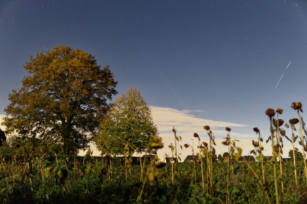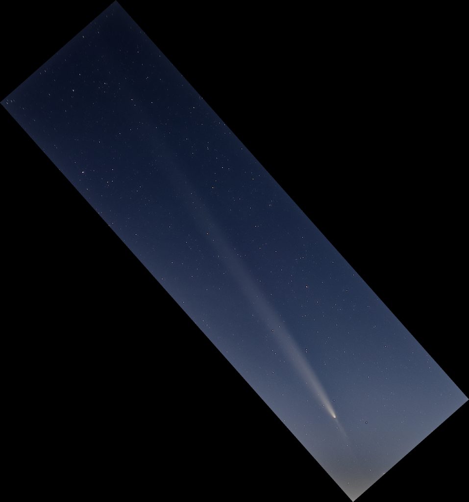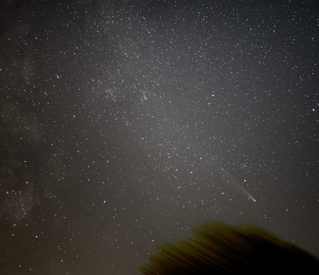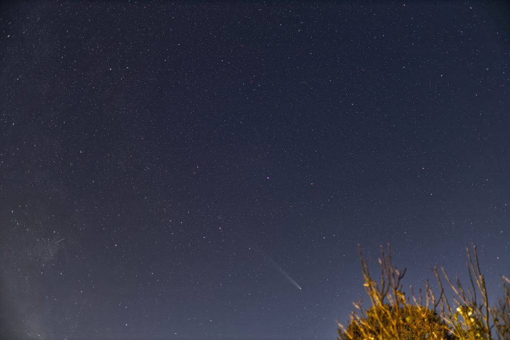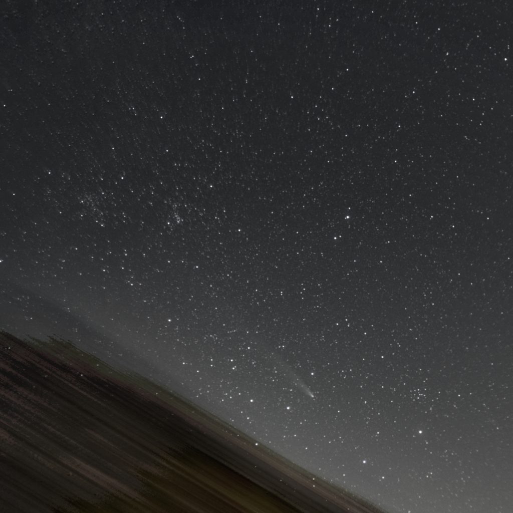 Gegen 19:22 MEZ ist rechts im Bild noch eine Kette von Starlink Satelliten von einem Start vor einem Tag (G10-13) zu sehen. Sie sind noch so nahe beieinander, dass bei der Belichtungszeit von 3 Sekunden nur ein Strich gezeigt wird und keine Einzelsatelliten. Der Komet ist ĂĽber dem Baum in der Bildmitte zu sehen.