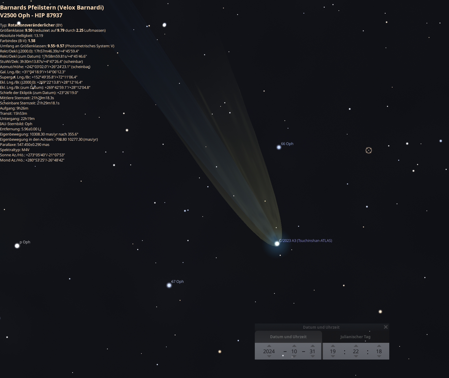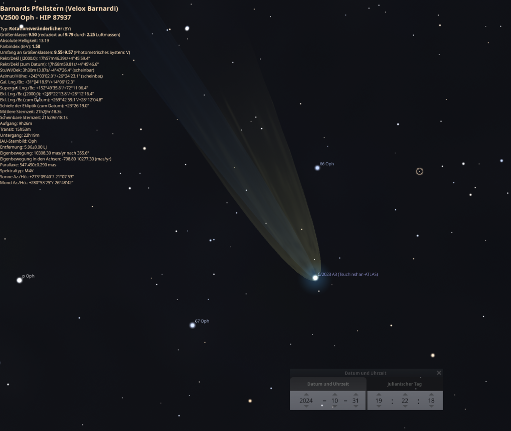 Am Abend des 31.10.2024 stand der Komet auch nahe an Barnards Pfeilstern, welcher auch auf dem Foto abgebildet ist.