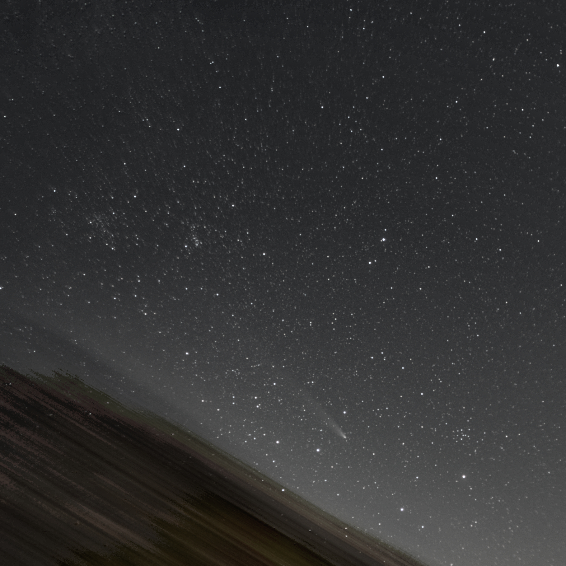 Der Kometenkopf steckt hinter einer Wolke und nur noch der Schweif ist zu sehen. Am rechten Bildrand die Spuren der Starlink Satelliten. Videos von Starlink Satelliten habe ich auch hier: https://youtu.be/FzfPC1Me3To?feature=shared und hier https://youtu.be/gZVmh-t1jSM