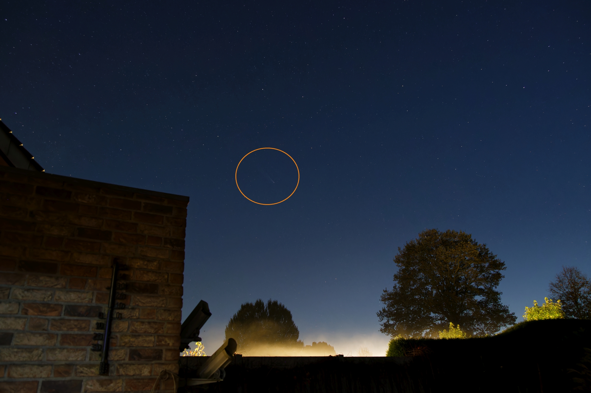 Der Komet am 23.10. bei aufziehendem Nebel und Gartenbeleuchtung.