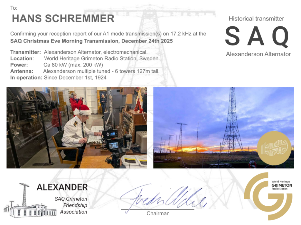 Am 24.12.2025 wurde wieder der historische Längstwellensender SAQ Grimeton in Betrieb genommen. Auf 17,2kHz wurde als Morsecode eine Botschaft gesendet. Der Vorgang wurde auch live auf Youtube übertragen. Ich konnte die Übertragung mit dem VLF Empfänger aus dem Garten aufzeichnen.
