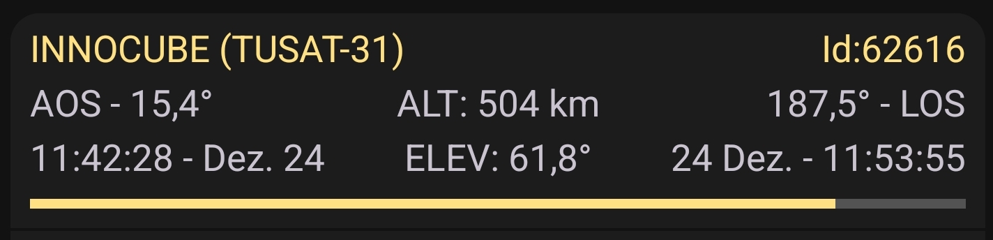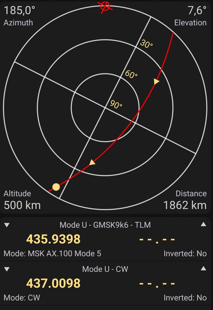 Bildschirmaufnahme des Überfluges mit Ton. Die Antenne wurde per Hand dem Satelliten nachgeführt wobei die Position anhand der hier gezeigten App Look4Sat bestimmt wurde. Der gelbe Kreis zeigt die Position des Satelliten aus der App. Die rote, kreisförmige Markierung, zeigt den Erfolg der Nachführung. Dieses Verfahren ist notwendig, das der Satellit am Tag und vermutlich auch bei Nacht mit bloßem Auge nicht sichtbar ist.