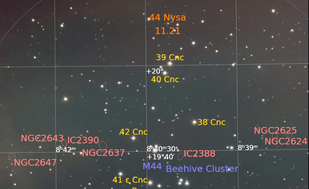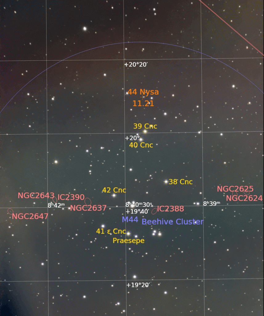 Aufgenommen am 26.4.2026. Der Kleinplanet hat sich über die 40 Minuten lange Belichtungszeit als kurze Strichspur abgebildet. 70 Einzelaufnahmen á 30 Sekunden wurden mit dem Seestar S30 aufgenommen. Die Animation (nach einem Klick auf das Bild) zeigt die Markierung zum Start und zum Ende der Belichtungsreihe.
