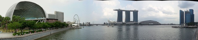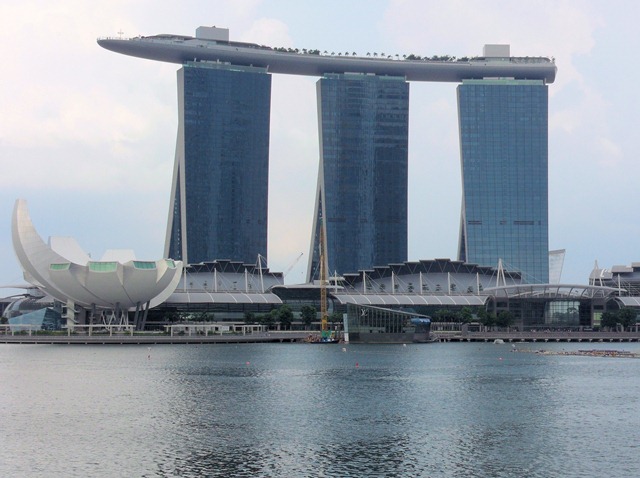 Singapur Bay. Links ein Gebäude, dessen Außenverkleidung einer Durian-Frucht (Stinkfrucht) ähnelt. In der Mitte das Marina Bay Sands Hotel und weiter rechts das Bankenviertel.