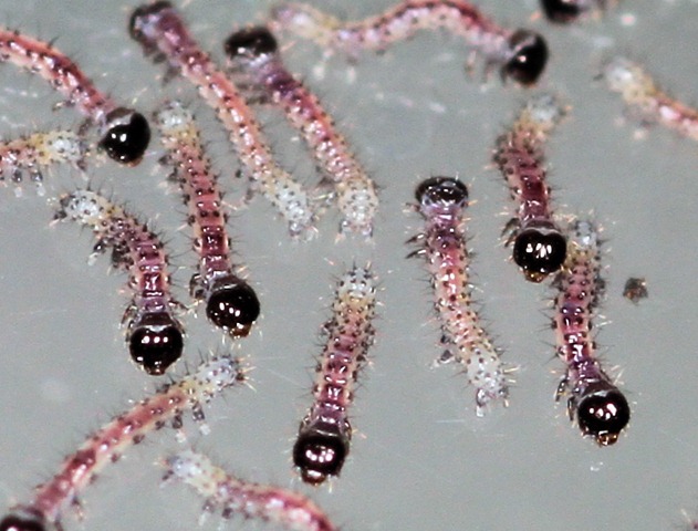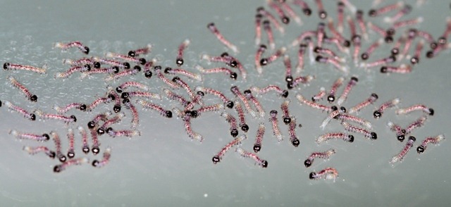 Nachdem seit einigen Tagen etwa 100 kleine Eier an der Außenseite einer Fensterscheibe zu erkennen waren, sind aus den Eiern heute Nacht kleine Raupen geschlüpft. Sie sind etwa 5mm lang und bewegen sich fort indem sie einen “Buckel” machen (Wie eine sich spannende Hand, “Spannerraupe”). Zu welcher Spezies sie gehören ist mir nicht bekannt.