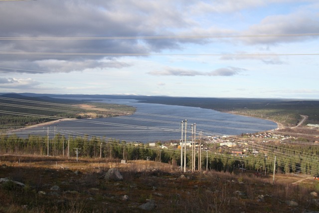 Blick vom Aussichtspunkt des Berges auf den See. Einzig die Hochspannungsleitungen stören den Blick etwas. Die Leitungen sind jedoch wichtig für den Ort. Schließlich gibt es ein Wasserkraftwerk, mit dem aus dem See Energie gewonnen wird (1.2 TWh pro Jahr).